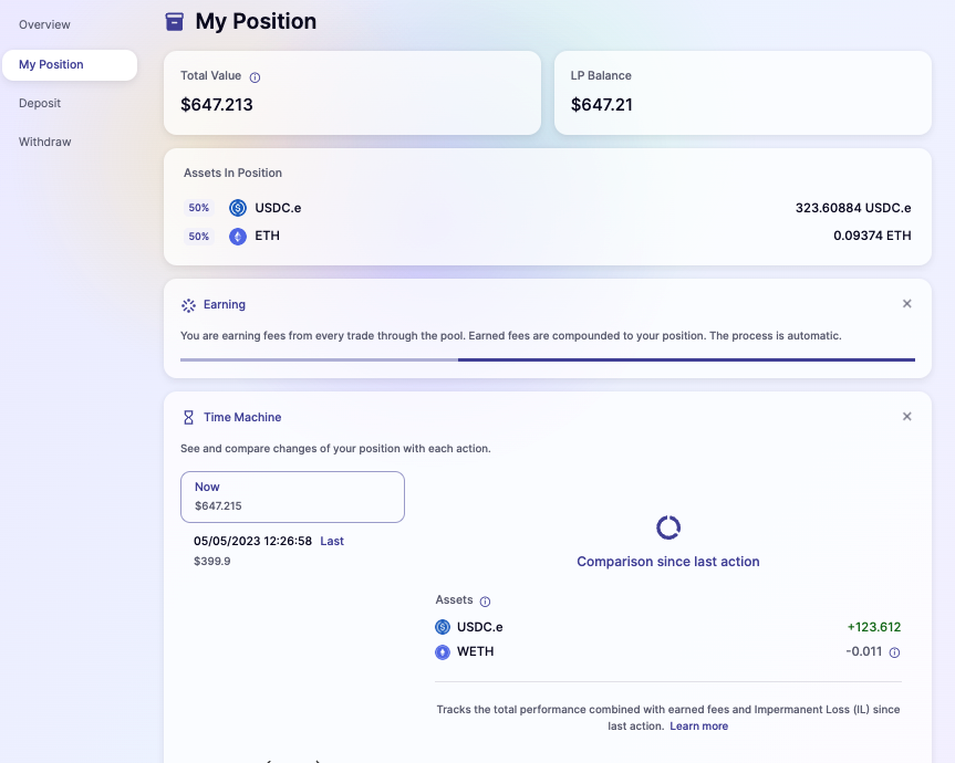 I started by providing liquidity on May 5, 2023, when my position was valued at $399.9. Over time, my position grew to $647.215, showing a healthy increase. Here’s the breakdown: